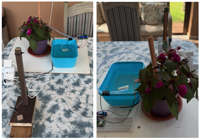 Sensors: A soil moisture sensor is calibrated to give a moisture percentage reading from the pot. A threshold is set, if the moisture level drops below this threshold it activates a pump to water the plant. This threshold is varied throughout the experiment to find an optimal level.