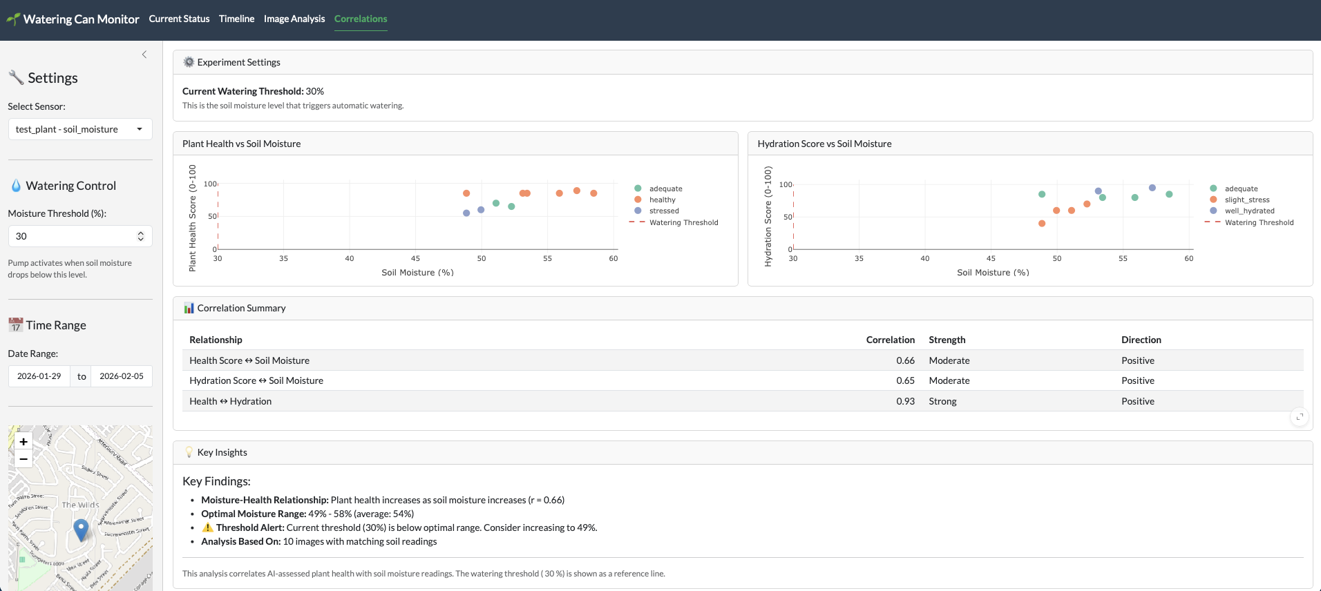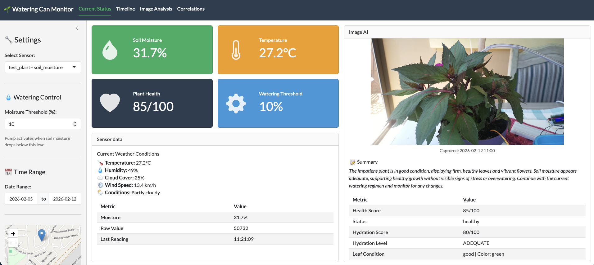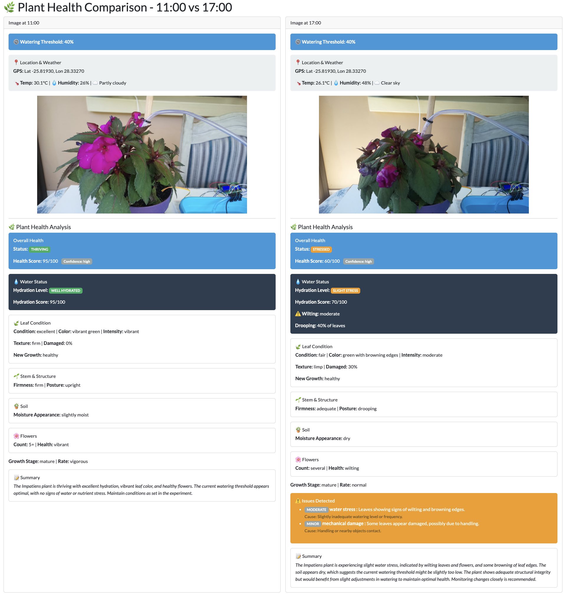 Images are taken every hour. These images are fed into an AI model in real-time together with a detailed prompt of what to look for and what data and in what structure to send the result. The model returns an overall health score based on the photo. This score is used as a numeric value in the project, eg for the correlation calculations. It also provides a detailed analysis in a structured format.