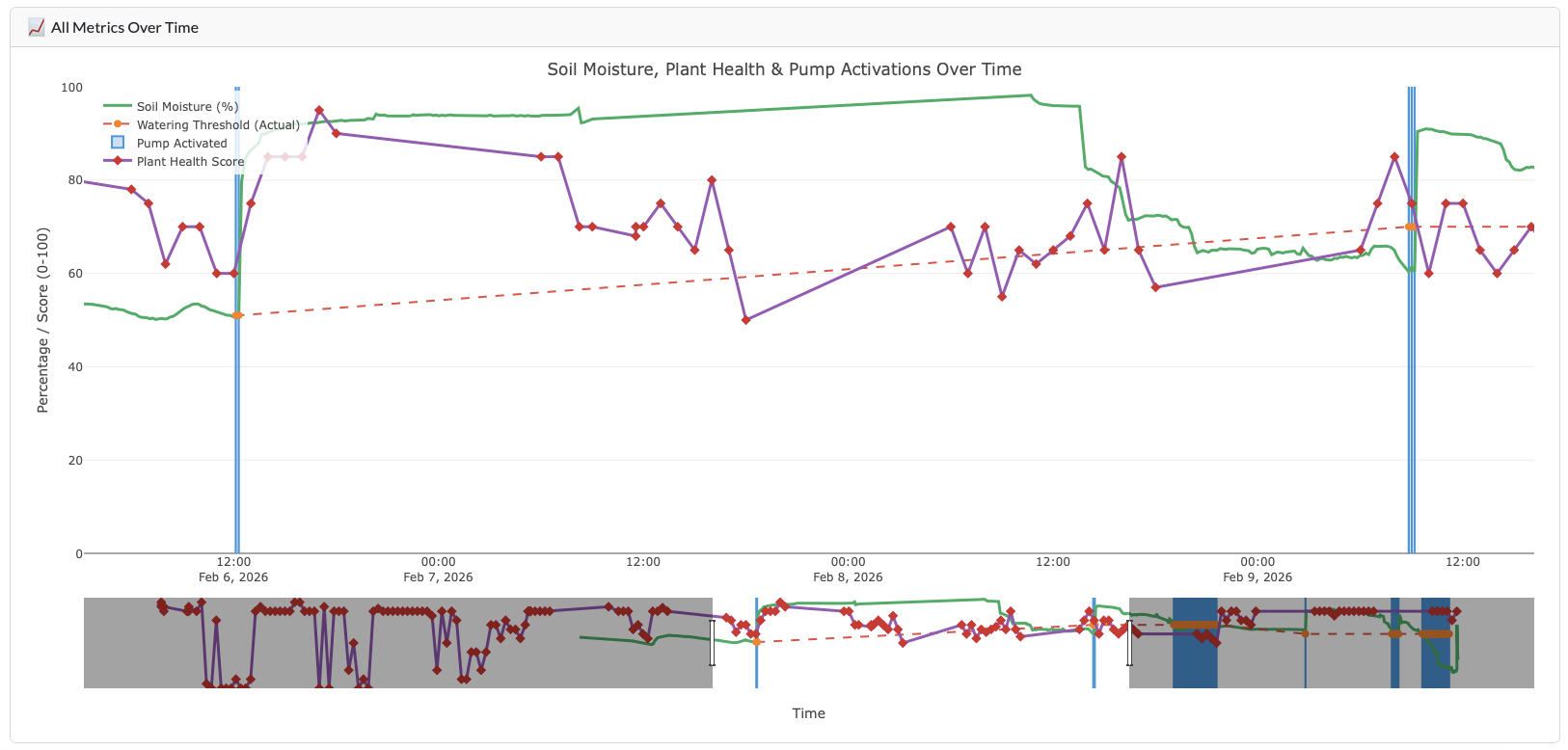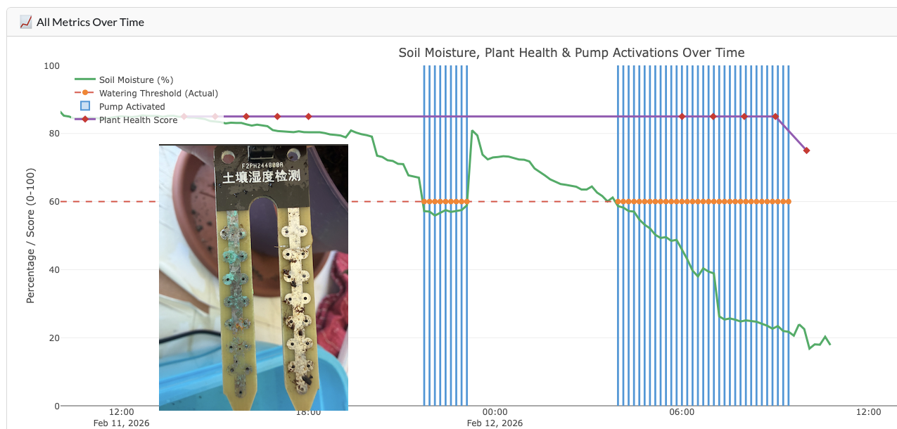 In this example, the soil moisture level continued to decline despite repeated pump activations, indicating that the physical outcome did not match the expected response. This discrepancy was identified as a sensor integrity issue caused by corrosion, and the sensor was replaced.